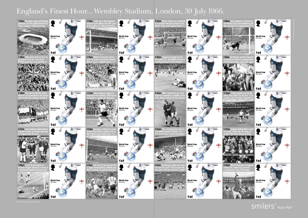 The sheet is captioned "England's Finest Hour... Wembley Stadium London, 30 July 1966". Each of the labels is different, and charts the day from 1pm when the gates were opened to let in 93,000 fans, through to 5.30pm when the England team saluted the crowd and paraded the cup which had been presented to England captain, the late Bobby Moore, by Her Majesty the Queen. The centre stamp on the 4th column includes the legendary words of commentator Kenneth Wolstenhome, "Some people are on the pitch. They think it's all over .... it is now.", uttered as Geoff Hurst scored the final goal.