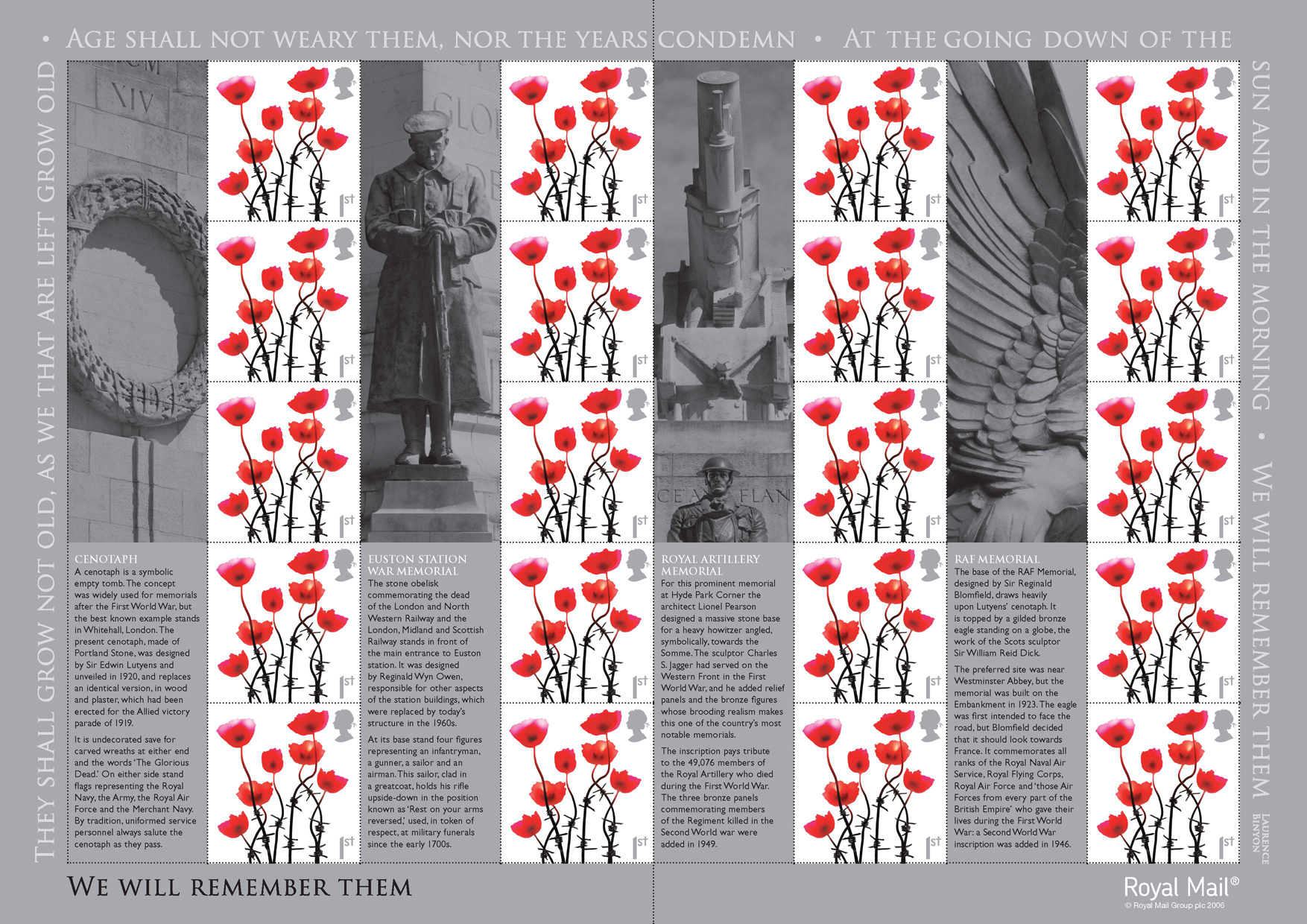 In response to public interest and in support of significant national activity in the next few years, Royal Mail will issue the first in a series of three miniature sheets to align with Remembrance Day in 2006, 2007 & 2008. The first sheet in the series will be issued on the 9th November 2006 to commemorate the 90th Anniversary of the Somme.