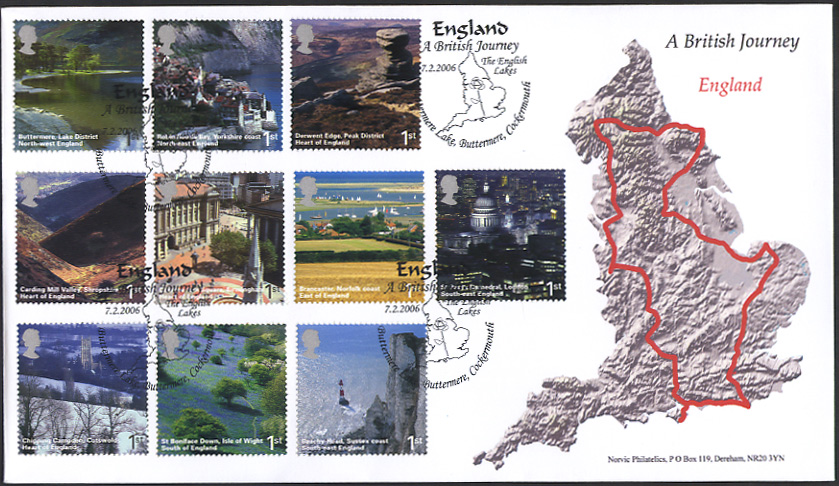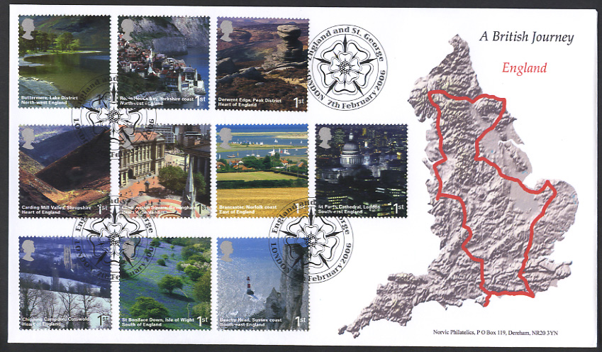 Norvic official first day cover for British Journey set of 10 stamps issued 7 Febrtuary 2006 and map postmark. Norvic official first day cover for British Journey set of 10 stamps issued 7 Febrtuary 2006 and rose postmark.