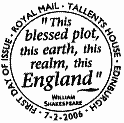 Official Philatelic Bureau FDI postmark with quotation from Shakespeare "This blessed plot, this earth, this realm, this England"