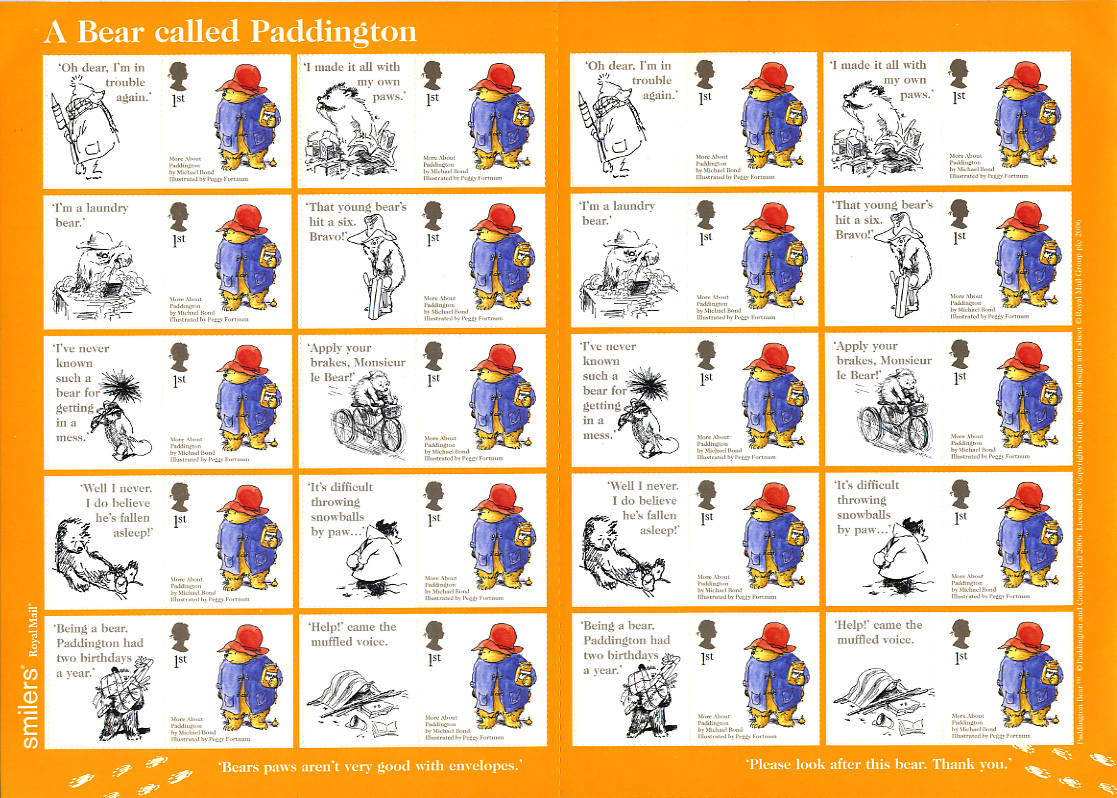 The Paddington Bear 1st class stamp will be issued in a self-adhesive Smilers Sheet of 20 stamps with labels featuring classic illustrations of Paddington from the original books. Click on the sheet to see a larger image.