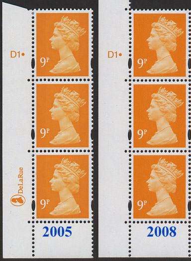 As with 2007's reprint of the 46p stamp, the 9p has now been reprinted by De La Rue from a new cylinder which retains the number D1. On the new printing the De La Rue logo is missing from the lower left corner and the colour name 'ORANGE' is printed in the left margin against row 3. The figure of value seems to be a little 'rounder', and the image of the head is quite different.